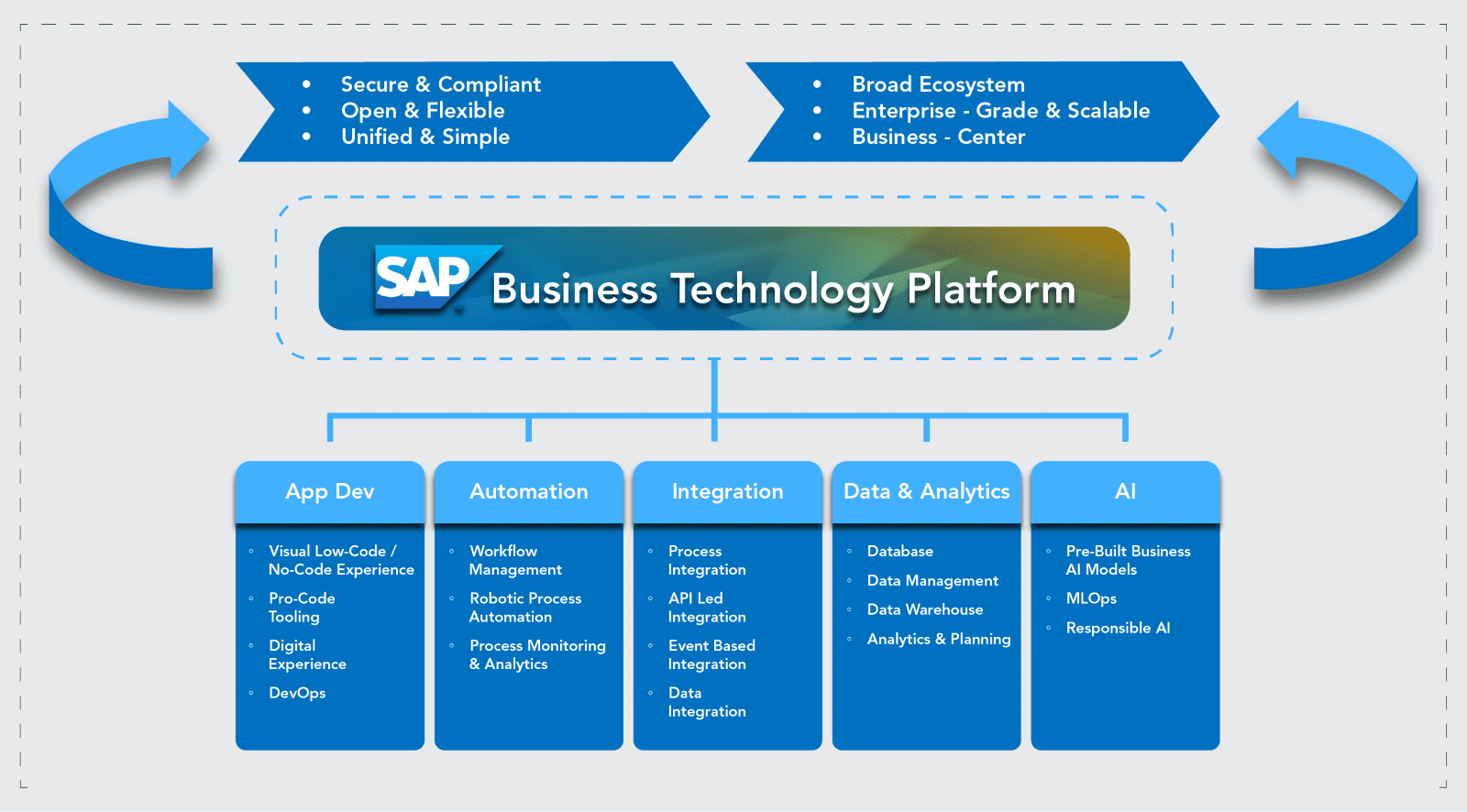 BTP is ever-inclusive of expanding opportunities to simplify, enhance, and extend the SAP experience. Risk-free, SAP-managed APIs, facilitating limitless integration options, empower SAP users with the energetic potential to win the AI race while retaining the core data and processes that define an enterprise’s essential functions.